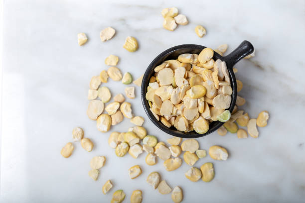 Split fava beans are mature, dried fava beans that have had their outer hulls removed and are then split into halves. They are pale yellow and used widely in Middle Eastern, African, and South Asian cuisine. They are valued for their high protein content and ease of cooking.