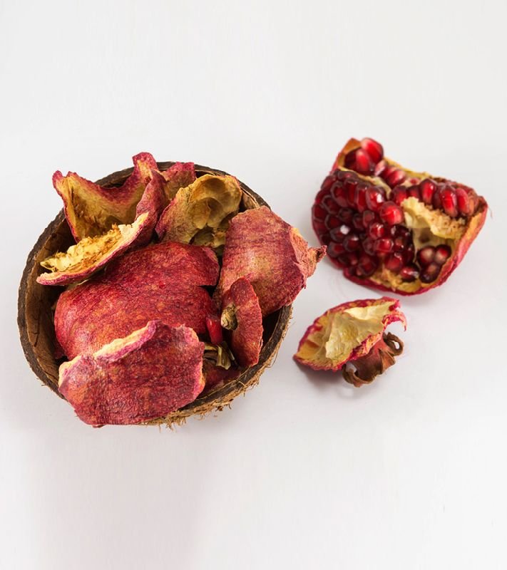 Pomegranate peel is the outer skin of the pomegranate fruit, usually discarded but known for its high medicinal and antioxidant properties. When dried, it has a tough, leathery texture and a slightly bitter taste. It is widely used in traditional medicine, cosmetics, and sometimes in food applications.
